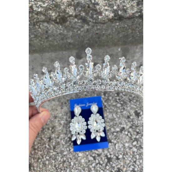 İvanna Gümüş Gelin Kına Tacı Özel Gün Aksesuar Kadın Taç Ve Üç Mekik Küpe Takımı-IVANA-12